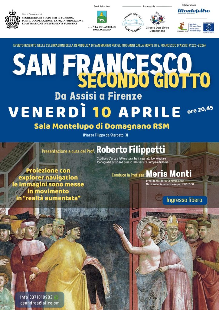 Nell’anno dedicato all’ottavo centenario dalla morte di S. Francesco d’Assisi (1226-2026) una stupenda occasione per scoprire la figura di Francesco attraverso gli occhi di Giotto si terrà Venerdì 10 aprile (ore 20,45) presso la Sala Montelupo di Domagnano, con l’incontro: “SAN FRANCESCO SECONDO GIOTTO. Da Assisi a Firenze” con il Prof. Roberto Filippetti (Studioso d’arte e letteratura, docente di Iconologia e Iconografia cristiana presso l’Università Europea di Roma). Condurrà la serata la Prof.ssa Meris Monti (Presidente della Commissione Nazionale Sammarinese per l’UNESCO). L’appuntamento è ad ingresso libero fino ad esaurimento posti. L’evento è organizzato dal CENTRO SOCIALE S. ANDREA DI… ...