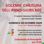 Siamo invitati alla solenne celebrazione di chiusura del Giubileo indetto da Papa Francesco con la Bolla “Spes non confundit” del 9 maggio 2024. A livello diocesano il Giubileo si chiuderà domenica 28 dicembre, festa della Santa Famiglia di Gesù, Giuseppe e Maria, con una concelebrazione eucaristica presieduta da S.E. Mons. Domenico Beneventi nella Cattedrale di […]
